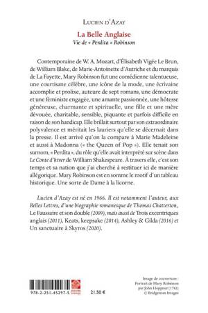 Contemporaine de W. A. Mozart, d'Elisabeth Vigee Le Brun, de William Blake, de Marie-Antoinette d'Autriche et du marquis de La Fayette, Mary Robinson fut une comedienne talentueuse, une courtisane celebre, une icone de la mode, une ecrivaine accomplie et prolixe, auteure de sept romans, une democrate et une feministe engagee, une amante passionnee, une hotesse genereuse, charmante et spirituelle, une fille et une mere devouee, charitable, sensible, piquante et parfois difficile en raison de son handicap. Elle brillait surtout par son extraordinaire polyvalence et meritait les lauriers qu'elle se decernait dans la presse. Il est arrive qu'on la compare a Marie Madeleine et aussi a Madonna ( the Queen of Pop ). Elle tenait son surnom, Perdita , du role qu'elle avait interprete sur scene dans Le Conte d'hiver de William Shakespeare. A travers elle, c'est son temps et sa nation que j'ai cherche a restituer ici de maniere allegorique. Mary Robinson est en somme le motif d'un tableau historique. Une sorte de Dame a la licorne.