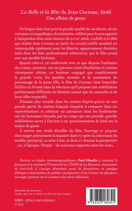 De longue date loué pour la grande qualité de ses décors, de ses costumes et maquillages, de sa lumière, célébré pour le soin apporté à l'adaptation d'un conte fameux du XVIIIe siècle, La Belle et la Bête que réalise Jean Cocteau au sortir du second conflit mondial est remarquable également pour les libertés, apparemment discrètes mais dans les faits profondément subversives, que le film prend avec son modèle littéraire (...). À travers une étude détaillée du film, l'ouvrage se propose d'envisager précisément la manière dont s'y opère la subversion du modèle patriarcal, sa mise à bas et dont s'y dessine la perspective - ou, à l'époque, l'utopie - de nouveaux rapports entre les sexes.