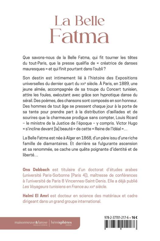 Que savons-nous de la Belle Fatma, qui fit tourner les têtes du tout-Paris, que la presse qualifia de « créatrice de danses mauresques », et qui finit pourtant dans l’oubli ? Son destin est intimement lié à l’histoire des Expositions universelles du dernier quart du XIXe siècle. A Paris, en 1889, une jeune almée, accompagnée de sa troupe du Concert tunisien, attire les foules, exécutant avec grâce son hypnotique danse du sérail. Des poèmes, des chansons sont composés en son honneur. Des hommes de tout âge se pressent chaque jour à la porte de sa tente pour prendre part à la distribution d’oeillades et de sourires que la charmeuse prodigue sans compter, Victor Hugo et Louis Ricard – le ministre de la Justice de l’époque – y compris... La Belle Fatma est née à Alger en 1868, d’un père issu d’une riche famille de commerçants en diamants. Et derrière sa fulgurante ascension et sa renommée, se cache une quête poignante d’identité et de liberté...