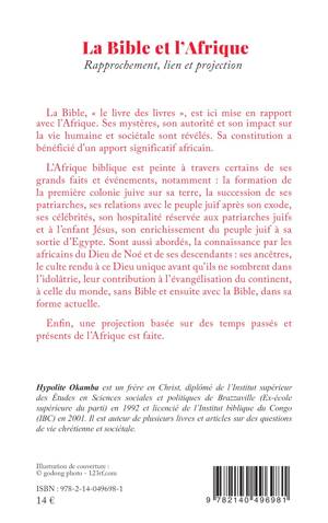 La Bible, le livre des livres, est ici mise en rapport avec l'Afrique. Ses mystères, son autorité et son impact sur la vie humaine et sociétale sont révélés. Sa constitution a bénéficié d'un apport significatif africain. L'Afrique biblique est peinte à travers certains de ses grands faits et événements, notamment la formation de la première colonie juive sur sa terre, la succession de ses patriarches, ses relations avec le peuple juif après son exode, ses célébrités, son hospitalité réservée aux patriarches juifs et à l'enfant Jésus, son enrichissement du peuple juif à sa sortie d'Egypte. Sont aussi abordés, la connaissance par les africains du Dieu de Noé et de ses descendants ses ancêtres, le culte rendu à ce Dieu unique avant qu'ils ne sombrent dans l'idolâtrie, leur contribution à l'évangélisation du continent, à celle du monde, sans Bible et ensuite avec la Bible, dans sa forme actuelle. Enfin, une projection basée sur des temps passés et présents de l'Afrique est faite.
