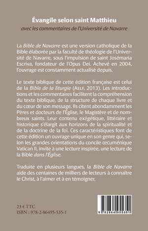 Le texte biblique de cette édition française est celui de la Bible de la liturgie (Aelf, 2013). Les introductions et les commentaires facilitent la compréhension du texte biblique, de la structure de chaque livre et du coeur de son message. Ils citent abondamment les Pères et docteurs de l'Église, le Magistère et de nombreux saints. Leur contenu exégétique, littéraire et historique s'élargit aux horizons de la spiritualité et de la doctrine de la foi. Ces caractéristiques font de cette édition un ouvrage unique en son genre qui, selon les grandes orientations du concile oecuménique Vatican II, invite à une lecture inspirée, une lecture de la Bible dans l'Église. Traduite en plusieurs langues, la Bible de Navarre aide des centaines de milliers de lecteurs à connaître le Christ, à l'aimer et à en témoigner.