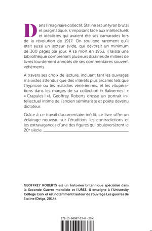 Dans l’imaginaire collectif, Staline est un tyran brutal etpragmatique, coupant le noeud gordien du premier Politburo pour s’imposer faceaux intellectuels et idéalistes qui avaient été ses camarades lors de larévolution de 1917. Il est rarement souligné qu’il était aussi un ferventidéologue et un lecteur vorace, qui s’imposait un minimum de 300 pages par jour.Après l’attaque cérébrale qui l’emporta en 1953, il laissa une bibliothèquecomprenant plusieurs dizaines de milliers de livres —dispersés entre son bureaudu Kremlin et ses datchas — lourdement annotés de ses commentaires souventvéhéments. À travers ses choix de lecture, incluantaussi bien les ouvrages attendus de politologie et de stratégie que des intérêtsplus arcanes tels que l’hypnose ou les maladies vénériennes, et les jugementscrus qu’il nota dans les marges de sa collection (« Balivernes ! » « Crapules !»), Geoffrey Roberts dresse un portrait intellectuel de l’ancien séminariste etpoète devenu dictateur qui révèle ses préoccupations les plus intimes. On ydécouvre un homme obsédé par l’idée de se parfaire, possédant des opinionsparfois informées et parfois péremptoires sur tous les domaines de laconnaissance humaine, au goût littéraire très arrêté et désireux de participer àpresque tout ce qui se publiait en URSS. LaBibliothèque de Staline, grâce à un travail documentaire inédit, offre unéclairage tout à fait nouveau sur l’érudition, les contradictions et lesextravagances d’une des figures qui transformèrent le 20e siècle.