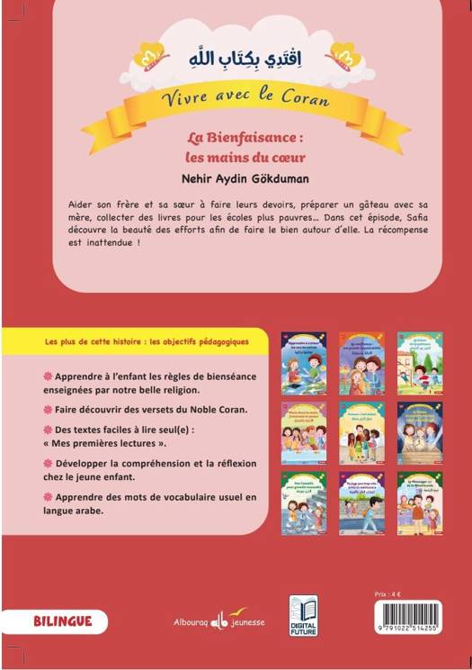 Immergez-vous dans l’univers chaleureux et lumineux de Safia et de sa famille, où chaque jour est l’occasion d’apprendre et de grandir. À travers les petits gestes quotidiens, cette série de 10 livres bilingues guide les enfants vers une compréhension douce et inspirante de valeurs essentielles comme le respect, la générosité, et l’amour familial, le tout éclairé par la sagesse des versets coraniques : 3- La Bienfaisance : les mains du coeur Aider son frère et sa sœur à faire leurs devoirs, préparer un gâteau avec sa mère, collecter des livres pour les écoles plus pauvres… Dans cet épisode, Safia découvre la beauté des efforts afin de faire le bien autour d’elle. La récompense est inattendue !Autres épisodes : 1- Apprendre à s’aimer les uns les autres2- La Confiance : une grande responsabilité 4- Le Trésor de la Patience5- Main dans la main : Fraternité et amour6- Donner c'est aimer 7- Le Temps, un cadeau précieux8- Des Conseils pour grandir ensemble9- Ne juge pas trop vite : Évite la médisance10- Le Messager (ﷺ) de la Miséricorde