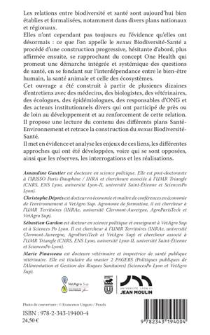 Les relations entre biodiversité et santé sont aujourd'hui bien établies et formalisées, notamment dans divers plans nationaux et régionaux. Cet ouvrage a été construit à partir de plusieurs dizaines d'entretiens avec des médecins, des biologistes, des vétérinaires, des écologues, des épidémiologues, des responsables d'ONG et des acteurs institutionnels divers qui ont participé de près ou de loin au développement et au renforcement de cette relation. Il propose une lecture du contenu des différents plans Santé-Environnement et retrace la construction du nexus Biodiversité-Santé. Il met en évidence et analyse les enjeux de ces liens, les différentes approches qui ont été développées, voire qui se sont opposées, ainsi que les réserves, les interrogations et les réalisations.