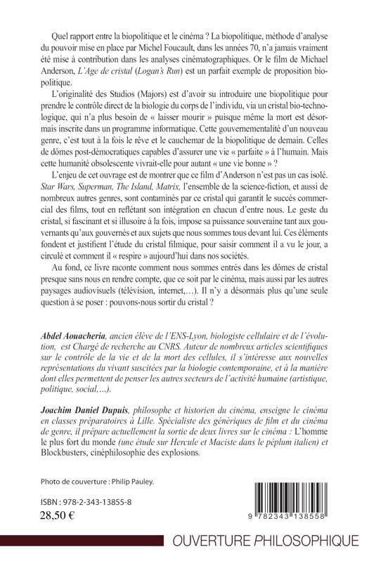 Quel rapport entre la biopolitique et le cinéma ? La biopolitique, méthode d'analyse du pouvoir mise en place par Michel Foucault, n'a jamais vraiment été mise à contribution dans les analyses cinématographiques. Le film de Michael Anderson, L'Age de cristal est un parfait exemple de proposition biopolitique. C'est la gouvernementalité d'un nouveau genre, celle de dômes post-démocratiques capables d'assurer une vie « parfaite ». Mais est-elle une « vie bonne » ? Ce livre raconte comment nous sommes entrés dans les dômes de cristal à notre insu. Pouvons-nous en sortir ?