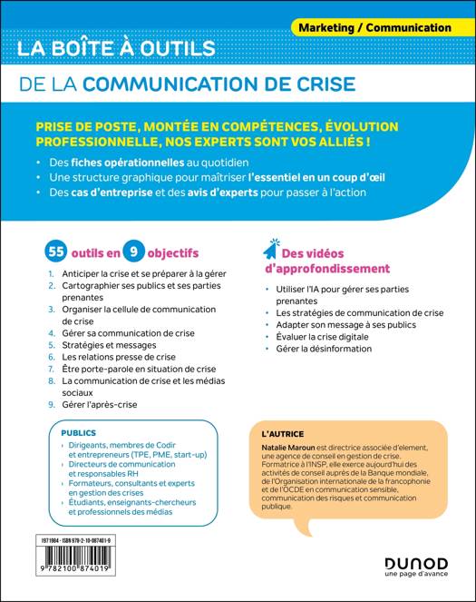 Les publics sont désormais intolérants au délai de réponse, et le silence est devenu inacceptable dans les situations de crise. Cet ouvrage vise donc à donner les clés pour préparer une communication de crise efficiente. La boîte à outil de la communication de crise a pour ambition de donner les clefs de cette discipline, souvent mystifiée, à toute personne souhaitant se préparer à communiquer face à l’inconnu, dans l’urgence et dans l’incertitude. Ces outils ont été longtemps gardés par les consultants experts, distillés au cours des formations et les accompagnements des organisations. Aujourd’hui, notre constat est que ce sont des outils indispensables pour la gestion de la réputation de toute organisation publique ou privée. Destiné autant aux personnes expérimentées souhaitant une méthodologie pour conforter leur pratique, aux communicants (du service public ou des organisations privées) et consultants en communication, ainsi qu’aux chefs de petites entreprises, l’ouvrage balaie les grandes étapes du process de communication de crise allant de la préparation à la reconstruction en passant par la réponse.