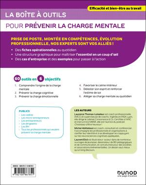 Mais il est possible de « reprendre le contrôle » et d’ajuster ce fonctionnement pour retrouver de l’espace mental (cognitif et émotionnel) et préserver l’estime de soi. L’ouvrage s’attache à éclairer les mécanismes potentiellement générateurs de charge mentale, puis propose des outils pour s’en prémunir : renforcer nos qualités de concentration et muscler l’estime de soi pour préserver nos capacités cognitives et émotionnelles, reprendre la main sur son organisation et la gestion de son temps, instaurer des rituels de récupération…