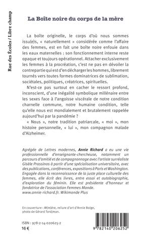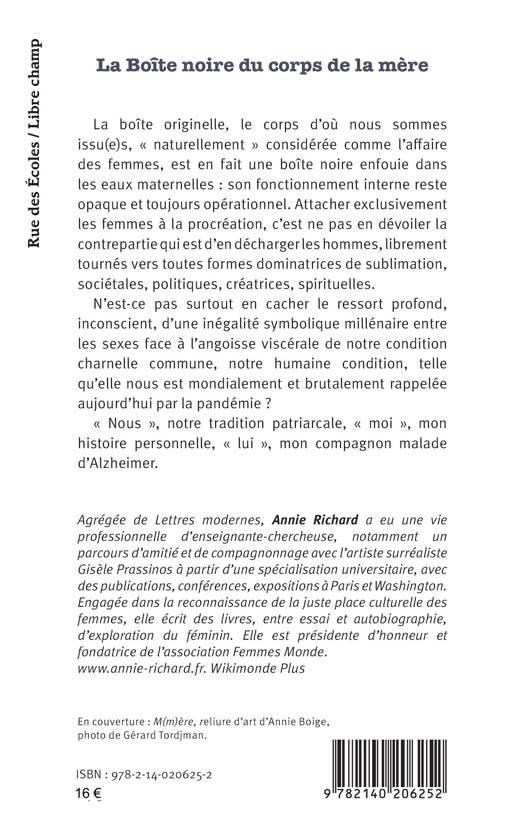 La boite originelle, le corps d’où nous sommes issu(e)s, « naturellement » considérée comme l’affaire des femmes, est en fait une boite noire enfouie dans les eaux maternelles : son fonctionnement interne reste opaque et toujours opérationnel. Attacher exclusivement les femmes à la procréation, c’est ne pas en dévoiler la contrepartie qui est d’en décharger les hommes, librement tournés vers toutes formes dominatrices de sublimation, sociétales, politiques, créatrices, spirituelles. N’est-ce pas surtout en cacher le ressort profond, inconscient, d’une inégalité symbolique millénaire entre les sexes face à l’angoisse viscérale de notre condition charnelle commune, notre humaine condition, telle qu’elle nous est mondialement et brutalement rappelée aujourd’hui par la pandémie ? « Nous », notre tradition patriarcale, « moi », mon histoire personnelle, « lui », mon compagnon malade d’Alzheimer.