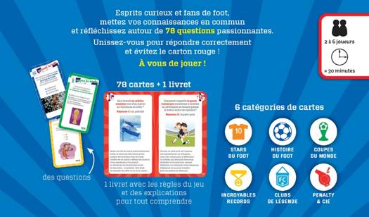Une boîte de jeu pour tous les fans de foot : 78 questions, réparties en 6 catégories : Incroyables records, Pénalty & cie, Stars du foot, Histoire du foot, Clubs de légende, Coupes du monde. Pour faire gagner son équipe, il faut valider les 6 thématiques proposées en répondant correctement à 2 questions par catégorie. Dans le livret : la règle du jeu et toutes les réponses. Jeu collaboratif pour tester son esprit d’équipe ! De 2 à 6 joueurs. Durée d'une partie : environ 30 minutes.
