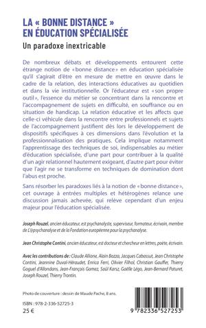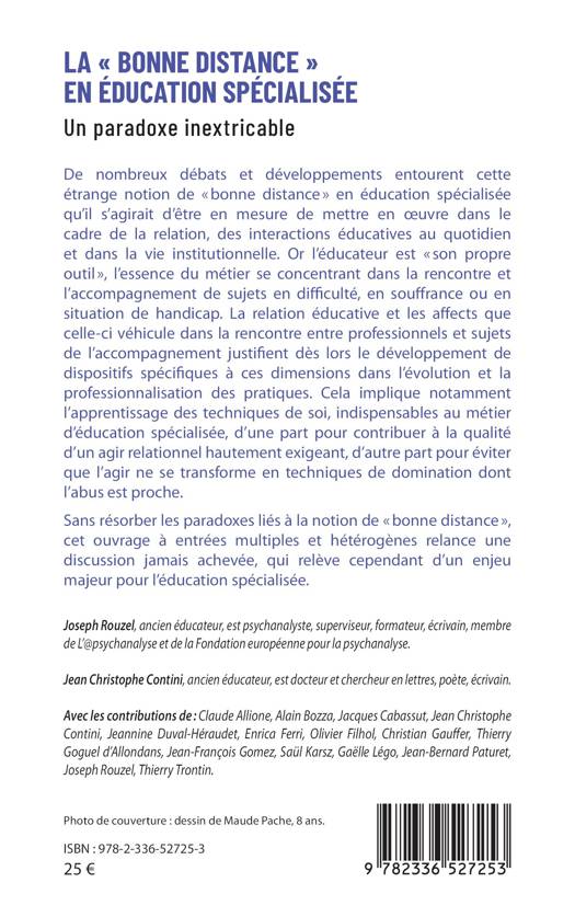 De nombreux débats et développements entourent cette étrange notion de bonne distance en éducation spécialisée qu'il s'agirait d'être en mesure de mettre en oeuvre dans le cadre de la relation, des interactions éducatives au quotidien et dans la vie institutionnelle. Or l'éducateur est son propre outil, l'essence du métier se concentrant dans la rencontre et l'accompagnement de sujets en difficulté, en souffrance ou en situation de handicap. La relation éducative et les affects que celle-ci véhicule dans la rencontre entre professionnels et sujets de l'accompagnement justifient dès lors le développement de dispositifs spécifiques à ces dimensions dans l'évolution et la professionnalisation des pratiques. Cela implique notamment l'apprentissage des techniques de soi, indispensables au métier d'éducation spécialisée, d'une part pour contribuer à la qualité d'un agir relationnel hautement exigeant, d'autre part pour éviter que l'agir ne se transforme en techniques de domination dont l'abus est proche. Sans résorber les paradoxes liés à la notion de bonne distance, cet ouvrage à entrées multiples et hétérogènes relance une discussion jamais achevée, qui relève cependant d'un enjeu majeur pour l'éducation spécialisée.