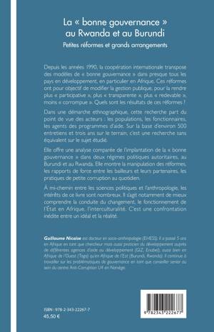 Depuis 1990, la coopération internationale propose des modèles de bonne gouvernance ayant pour but de modifier la gestion publique, en améliorant sa transparence et en réduisant sa corruption. Cette recherche se basant sur 500 entretiens recueillis en trois ans, se place au coeur de deux régimes autoritaires, le Rwanda et le Burundi. Elle montre la manipulation des réformes, et la pratique de la corruption au quotidien. Cet ouvrage permet de mieux comprendre le fonctionnent de l'Etat en Afrique, la confrontation entre un idéal et une réalité.
