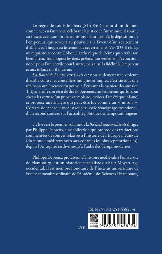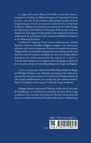 La Bonté de l’empereur Louis est non seulement une violente diatribe contre les conseillers indignes et impies, c’est surtout une réflexion sur l’exercice du pouvoir. Écrivant à la manière des annales, Thégan truffe son récit de développements sur les thèmes qui lui sont chers (les vertus d’un prince exemplaire, les vices d’un évêque infâme) et propose une analyse qui peut être lue comme un « miroir ». Ce texte, dont chaque mot est soupesé, est le témoignage exceptionnel d’un second couteau sur l’actualité politique des temps carolingiens.
