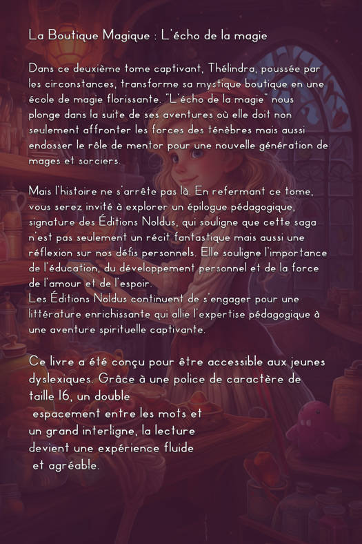 Plongez au cœur d'une série captivante où chaque tome vous transporte plus loin dans un univers où la magie est reine. Suivez Thélindra, une sorcière devenue magicienne, qui ouvre les portes de sa boutique transformée en école pour former la prochaine génération de protecteurs de la lumière. Une aventure palpitante pour les 10-14ans ... jusqu'à 99ans aussi...