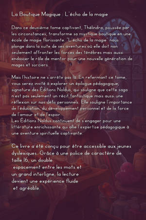 Ne manquez pas l'occasion de faire partie de cette aventure magique. Ajoutez "La Boutique Magique : L'écho de la magie" à votre bibliothèque et laissez la magie opérer. Cliquez sur "Ajouter au panier" et commencez votre voyage dans le monde enchanteur de Thélindra dès aujourd'hui !