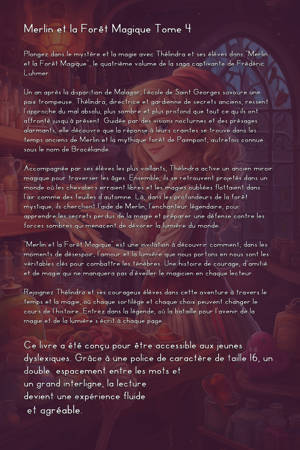 Plongez dans une aventure où chaque sortilège et chaque décision peuvent altérer le cours de l'histoire. Le TOME 4 "Merlin et la Forêt Magique" est une invitation à explorer un monde où la magie et la légende se rencontrent pour révéler que le véritable pouvoir réside dans l'unité et l'amour inconditionnel.