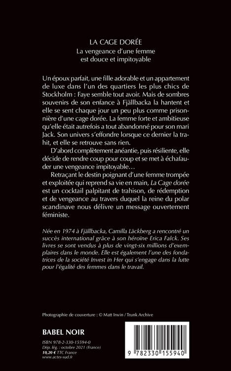 Un époux parfait, une fille adorable et un appartement de luxe dans l'un des quartiers les plus chics de Stockholm : Faye semble tout avoir. Mais de sombres souvenirs de son enfance à Fjällbacka la hantent et elle se sent chaque jour un peu plus comme prisonnière d'une cage dorée. La femme forte et ambitieuse qu'elle était autrefois a tout abandonné pour son mari Jack. Son univers s'effondre lorsque ce dernier la trahit, et elle se retrouve sans rien. D'abord complètement anéantie, puis résiliente, elle décide de rendre coup pour coup et se met à échafauder une vengeance impitoyable... Retraçant le destin poignant d'une femme trompée et exploitée qui reprend sa vie en main, La Cage dorée est un cocktail palpitant de trahison, de rédemption et de vengeance au travers duquel la reine du polar scandinave nous délivre un message ouvertement féministe.