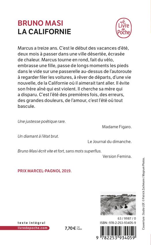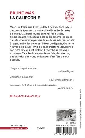 Marcus a treize ans. C’est l’été, le début des grandes vacances, deux longs mois à passer dans une ville désertée, écrasée de chaleur. Marcus tourne en rond, fait du vélo, embrasse une fille, passe de longs moments les pieds dans le vide sur une passerelle au-dessus de l’autoroute à regarder filer les voitures, à rêver de départs, d’une vie nouvelle, de la Californie où il aimerait tant aller. Il évite son frère aîné qu’il ne supporte pas qui est violent. Il cherche sa mère qui a disparu. C’est l’été des premières fois, des erreurs, des grandes douleurs, de l’amour, l’été où tout bascule.