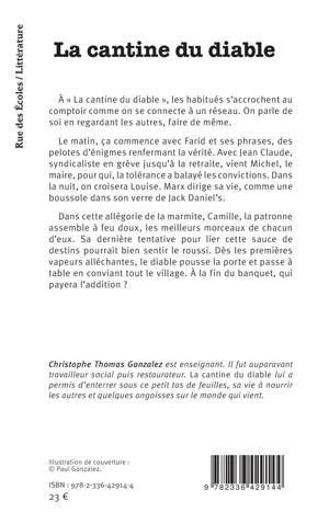 À La cantine du diable, les habitués s'accrochent au comptoir comme on se connecte à un réseau. On parle de soi en regardant les autres, faire de même. Le matin, ça commence avec Farid et ses phrases, des pelotes d'énigmes renfermant la vérité. Avec Jean Claude, syndicaliste en grève jusqu'à la retraite, vient Michel, le maire, pour qui, la tolérance a balayé les convictions. Dans la nuit, on croisera Louise. Marx dirige sa vie, comme une boussole dans son verre de Jack Daniel's. Dans cette allégorie de la marmite, Camille, la patronne assemble à feu doux, les meilleurs morceaux de chacun d'eux. Sa dernière tentative pour lier cette sauce de destins pourrait bien sentir le roussi. Dès les premières vapeurs alléchantes, le diable pousse la porte et passe à table en conviant tout le village. À la fin du banquet, qui payera l'addition ?