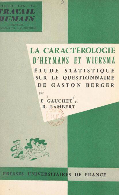 Dans la Collection du travail humain, Roger Lambert et François Gauchet nous présentent une étude réalisée au Service de Psychologie Appliquée de l'Association française pour l’Accroissement de la Productivité et au Laboratoire de Psychologie Appliquée de l’École Pratique des Hautes études. Depuis 1945, date de la première édition du Traité de caractérologie de René Le Senne, la caractérologie d'Heymans et Wiersma connaît en France une grande vogue. Les grands progrès qui ont été réalisés durant les cinquante dernières années dans le domaine de la statistique mathématique appliquée aux Sciences humaines doivent, en effet, nous permettre - à partir de données analogues à celles dont disposaient Heymans et Wiersma - d’effectuer des études plus poussées à la fois plus précises et plus nuancées.