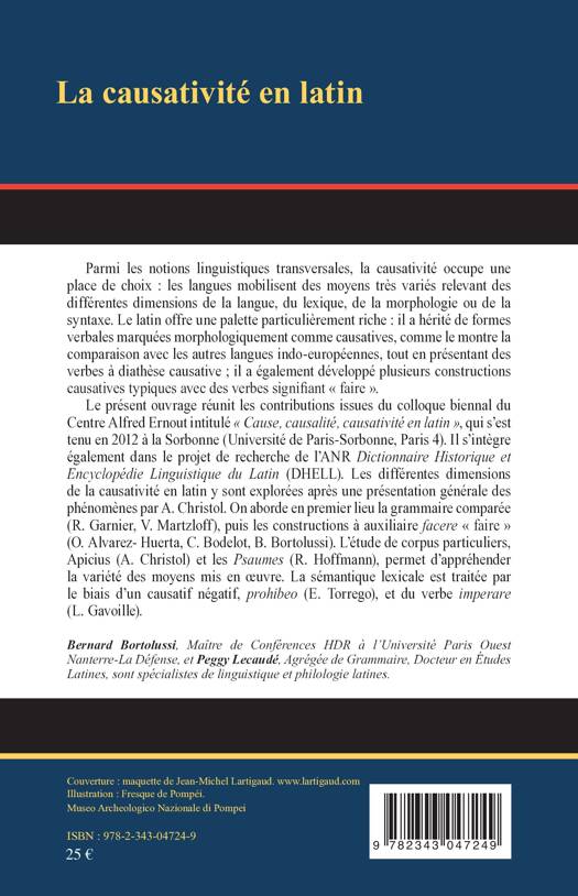 Parmi les notions linguistiques transversales, la causativité occupe une place de choix : les langues mobilisent des moyens très variés relevant des différentes dimensions de la langue, du lexique, de la morphologie ou de la syntaxe. Le latin offre une palette particulièrement riche : il a hérité de formes verbales marquées morphologiquement comme causatives, comme le montre la comparaison avec les autres langues indo-européennes ; il a également développé plusieurs constructions causatives typiques avec des verbes signifiant "faire".