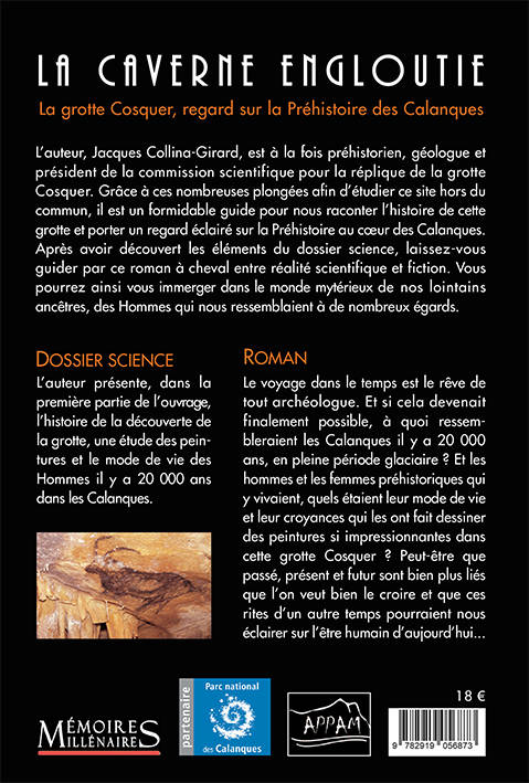 Alors que la reconstitution de la grotte Cosquer vient d'ouvrir à Marseille, laissez-vous guider, avant ou après sa visite, par ce roman à cheval entre réalité scientifique et une fiction captivante qui permet de s’imprégner du mode de vie à l’époque préhistorique dans les Calanques. DOSSIER SCIENCE : un Dossier Science de 32 pages signé par l'auteur qui a participé aux campagnes scientifiques afin de comprendre l'histoire de la découverte du site site et le mode de vie il y a 18 000 ans. ROMAN : Une navigation dans le temps amène à reconstituer la découverte d'une caverne engloutie dans le Massif des Calanques par les chercheurs. Le roman nous transporte au contact direct avec les artistes qui y ont peint et gravés animaux et signes il y a 18 000 ans. L'auteur conduit le lecteur dans une tentative de plongée dans les rites d'initiation de nos lointains ancêtres. Réalités et fictions, préalablement bien distinguées, se renvoient peu à peu la balle...