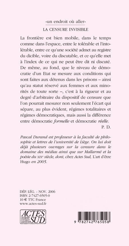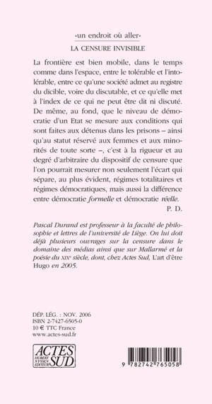 La censure, aujourd'hui, n'est plus que rarement l'interdiction d'un texte ou d'un message ; elle est bien davantage imposition non sentie d'écrire et de parler en un certain sens. Les médias, l'édition, la phraséologie politique ou économique, tels sont quelques-uns des lieux d'exercice de cette "censure invisible", qui échappe aux vigilances les mieux armées.
