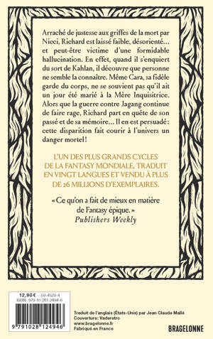 Grièvement blessé lors d'un combat contre les soudards de l'Ordre Impérial, Richard serait sans doute mort sans l'intervention de Nicci. Un sauvetage miraculeux qui laisse le Sourcier très faible, désorienté... et peut-être victime d'une formidable hallucination. En effet, quand il s'enquiert du sort de Kahlan, il découvre que personne, parmi ses compagnons, ne semble la connaître. Même Cara, sa fidèle garde du corps, ne se souvient pas qu'il ait un jour été marié à la Mère Inquisitrice. Alors que la guerre contre Jagang continue de faire rage, Richard part en quête de son passé et de sa mémoire. Il en est persuadé : cette disparition fait courir à l'univers un danger mortel !