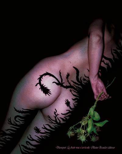 La Chair nue s'articule, un ouvrage de 48 pages de peintures sur corps. Une poupée de chair coincée dans une malle prend vie ... Plus de 60 peintures en ombres chinoises réalisées sur un seul corps ... Dans cet ouvrage Stéphane Blanquet poursuit sa recherche graphique de peinture sur corps, amorcée dans *Sur l'épiderme*. Les fantasmes sortent de la malle... Quelque part, au sous-sol, une malle... Enfermé, un prototype en un exemplaire d'une poupée rare, une poupée de chair, inanimée...