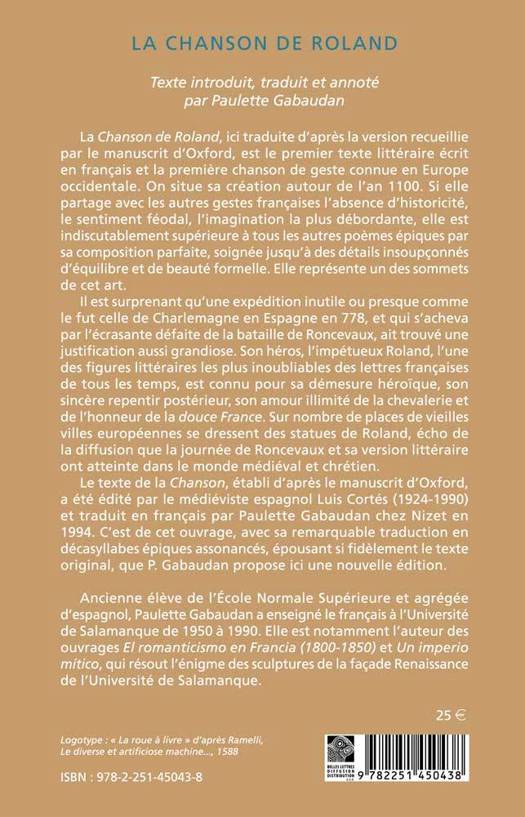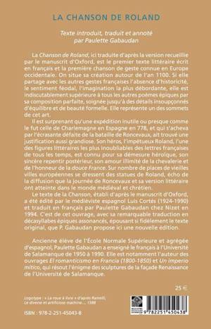 La Chanson de Roland, ici traduite d'après la version recueillie par le manuscrit d'Oxford, est le premier texte littéraire écrit en français et la première chanson de geste connue en Europe occidentale. On situe sa création autour de l'an 1100. Si elle partage avec les autres gestes françaises l'absence d'historicité, le sentiment féodal, l'imagination la plus débordante, elle est indiscutablement supérieure à tous les autres poèmes épiques par sa composition parfaite, soignée jusqu'à des détails insoupçonnés d'équilibre et de beauté formelle. Elle représente un des sommets de cet art.