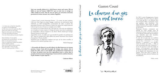 Libertaire, pourfendeur de l'injustice et dénonciateur de l'oppression des femmes et des petits paysans, voici le grand poète Gaston Couté enfin publié avec, récemment retrouvés, les ajouts et corrections de sa main en 1906 en vue d'une édition que, mort à trente ans, il ne vit jamais. Textes d'un conteur-né, d'un talent précoce qui, à dix-sept ans, a pu écrire une méditation sur la fatalité et la mort comme "Le champ de naviots", texte dont la profondeur est comparable à celle du "Fossoyeur" et du" Pauvre Martin" chantés par Georges Brassens soixante ans plus tard. Venu des moulins de Beauce à ceux de la Butte,. « celui qui s’était forgé son propre langage, au relief incomparable, ce braconnier du verbe, ce passeur des prétendues frontières entre Chanson et Poésie parvient à faire de qui le suit et l’écoute un complice ravi et fidèle. Aujourd’hui encore, un public qui a pu entendre les grandes voix poétiques du 20e siècle est conquis par le plus célèbre des auteurs méconnus (une centaine d’interprètes à l’heure actuelle)." Préface et présentation de son grand connaisseur Michel Desproges, Cahier couleur d'affiches et portraits, illustrations inédites, nombreux documents d'époque, pages manuscrites et notes passionnantes.