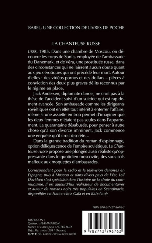 URSS, 1985. Dans une chambre de Moscou, on découvre les corps de Sonia, employée de l'ambassade du Danemark, et de Véra, une prostituée russe, dans des circonstances qui ne laissent aucun doute quant aux jeux érotiques qui ont précédé leur mort. Autour d'elles : des vidéos pornos et des dollars - pièces à conviction des deux plus graves délits reconnus par le régime en place. Jack Andersen, diplomate danois, ne croit pas à la thèse de l'accident suivi d'un suicide qui est rapidement avancée. Son ambassade comme les dirigeants soviétiques ont en effet tout intérêt à enterrer l'affaire, même si une assiette en trop laisse penser que les deux femmes n'étaient pas seules dans l'appartement. La quarantaine désabusée, pour penser à autre chose qu'à son divorce imminent, Jack commence une enquête qu'il croit discrète... Dans la grande tradition du roman d'espionnage, option déliquescence de l'empire soviétique, La Chanteuse russe propose une plongée aussi réaliste qu'oppressante dans le quotidien moscovite, des sous-sols mafieux aux moquettes d'ambassades.