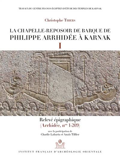 Édition en fac-similés des textes et scènes couvrant les parois de la chapelle-reposoir de barque bâtie au nom de Philippe Arrhidée au cœur du temple de Karnak. L'ouvrage présente les caractéristiques architecturales et techniques de cet édifice de granite et l'apport des faciès pétrographiques dans l'identification des blocs épars. Le programme iconographique et théologique est analysé. Le second volume livre la couverture photographique couleur du monument. La chapelle voisine consacrée à Amon-Min-Kamoutef et le portique de façade au nom de Thoutmosis III sont intégrés dans cet ouvrage.