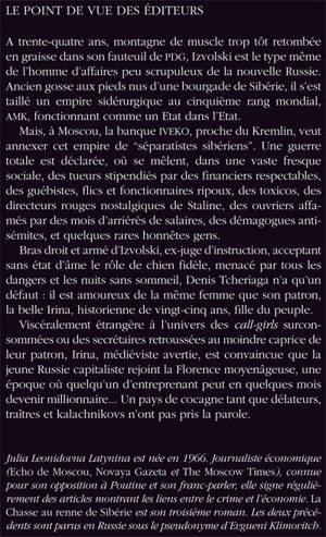 A trente-quatre ans, montagne de muscle trop tôt retombée en graisse dans son fauteuil de PDG, Izvolski est le type même de l'homme d'affaires peu scrupuleux de la nouvelle Russie. Ancien gosse aux pieds nus d'une bourgade de Sibérie, il s'est taillé un empire sidérurgique au cinquième rang mondial, AMK, fonctionnant comme un Etat dans l'Etat. Mais, à Moscou, la banque IVEKO, proche du Kremlin, veut annexer cet empire de "séparatistes sibériens". Une guerre totale est déclarée, où se mêlent, dans une vaste fresque sociale, des tueurs stipendiés par des financiers respectables, des guébistes, flics et fonctionnaires ripoux, des toxicos, des directeurs rouges nostalgiques de Staline, des ouvriers affamés par des mois d'arriérés de salaires, des démagogues antisémites, et quelques rares honnêtes gens. Bras droit et armé d'Izvolski, ex-juge d'instruction, acceptant sans état d'âme le rôle de chien fidèle, menacé par tous les dangers et les nuits sans sommeil, Denis Tcheriaga n'a qu'un défaut : il est amoureux de la même femme que son patron, la belle Irina, historienne de vingt-cinq ans, fille du peuple. Viscéralement étrangère à l'univers des call-girls surconsommées ou des secrétaires retroussées au moindre caprice de leur patron, Irina, médiéviste avertie, est convaincue que la jeune Russie capitaliste rejoint la Florence moyenâgeuse, une époque où quelqu'un d'entreprenant peut en quelques mois devenir millionnaire... Un pays de cocagne tant que délateurs, traîtres et kalachnikovs n'ont pas pris la parole.