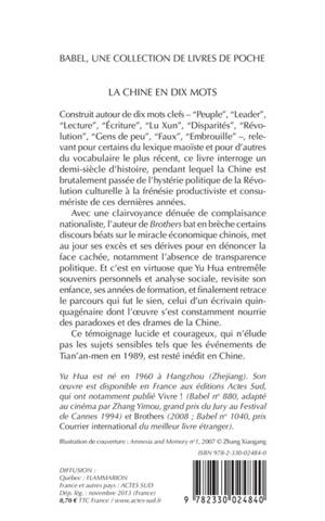 Clairvoyant, lucide, tendre, parfois ironique, toujours dénué de complaisance nationaliste, tel est le regard de l'auteur de "Brothers" sur son pays. Témoin d'un demi-siècle d'histoire chinoise, Yu Hua propose une analyse sociale pertinente et courageuse de la face cachée du miracle chinois. Et livre, en filigrane, le chemin d'un écrivain et de son oeuvre.
