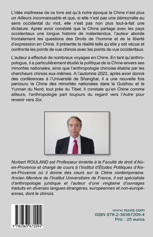 L’idée maîtresse de ce livre est qu’à notre époque la Chine n’est plus un Ailleurs inconnaissable et que, si elle n’est pas une démocratie au sens occidental du mot, elle n’est pas non plus tout-à-fait une dictature. Après avoir constaté que la Chine partage avec les pays occidentaux une longue histoire de malentendus, l’auteur aborde frontalement les questions des Droits de l’homme et de la liberté d’expres¬sion en Chine. Il présente la réalité telle qu’elle y est vécue et confronte les points de vue chinois avec les points de vue occidentaux. L’auteur a effectué de nombreux voyages en Chine. En tant qu’an¬thro¬pologue, il a particulièrement étudié la politique de la Chine envers ses minorités nationales, ainsi que l’anthropologie chinoise établie par les chercheurs chinois eux-mêmes. A l’automne 2023, après avoir donné des conférences à l’Université de Shanghai, il a une nouvelle fois parcouru la Chine des minorités nationales dans le Guizhou et le Yunnan du Nord, tout près du Tibet. Il constate qu’en Chine comme ailleurs, l’anthropologie part toujours du regard vers l’Autre pour revenir vers Soi.
