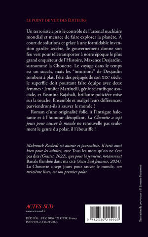 Un terroriste a pris le contrôle de l'arsenal nucléaire mondial et menace de faire exploser la planète. À court de solutions et grâce à une formidable invention gardée secrète, le gouvernement donne son feu vert pour télétransporter à notre époque le plus grand enquêteur de l'Histoire, Maxence Desjardin, surnommé la Chouette. Le voyage dans le temps est un succès, mais les "intuitions" de Desjardin tombent à plat. Pétri des préjugés de son XIXe siècle, le superflic doit pourtant faire équipe avec deux femmes : Jennifer Martinelli, génie scientifique asociale, et Yasmine Rajabali, brillante policière mise sur la touche. Ensemble et malgré leurs différences, parviendront-ils à sauver le monde ? Roman d'une originalité folle, à l'intrigue haletante et à l'humour désopilant, "La Chouette a sept jours pour sauver le monde" ne renouvelle pas seulement le genre du polar, il l'ébouriffe !
