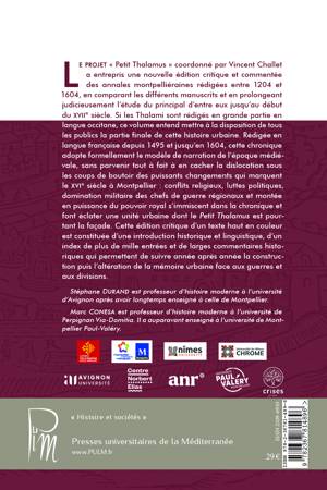 Le projet « Petit Thalamus » coordonné par Vincent Challet a entrepris une nouvelle édition critique et commentée des annales montpelliéraines rédigées entre 1204 et 1604, en comparant les différents manuscrits et en prolongeant judicieusement l’étude du principal d’entre eux jusqu’au début du XVIIe siècle. Si les Thalami sont rédigés en grande partie en langue occitane, ce volume entend mettre à la disposition de tous les publics la partie finale de cette histoire urbaine. Rédigée en langue française depuis 1495 et jusqu’en 1604, cette chronique adopte formellement le modèle de narration de l’époque médiévale, sans parvenir tout à fait à en cacher la dislocation sous les coups de boutoir des puissants changements qui marquent le XVIe siècle à Montpellier : conflits religieux, luttes politiques, domination militaire des chefs de guerre régionaux et montée en puissance du pouvoir royal s’immiscent dans la chronique et font éclater une unité urbaine dont le Petit Thalamus est pourtant la façade. Cette édition critique d’un texte haut en couleur est constituée d’une introduction historique et linguistique, d’un index de plus de mille entrées et de larges commentaires historiques qui permettent de suivre année après année la construction puis l’altération de la mémoire urbaine face aux guerres et aux divisions.