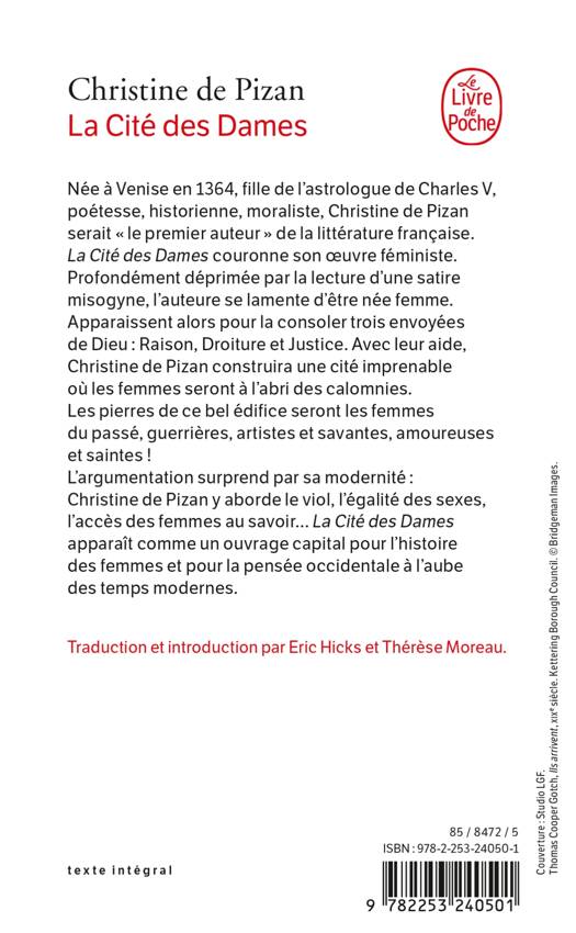 L’argumentation surprend par sa modernité : Christine de Pizan y aborde le viol, l’égalité des sexes, l’accès des femmes au savoir… La Cité des Dames apparaît comme un ouvrage capital pour l’histoire des femmes et pour la pensée occidentale à l’aube des temps modernes.