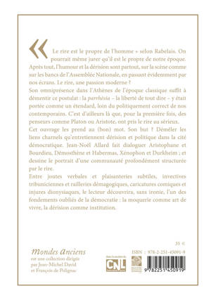 Le rire est le propre de l'homme selon Rabelais. On pourrait meme jurer qu'il est le propre de notre epoque. Apres tout, l'humour et la derision sont partout, sur la scene comme sur les bancs de l'Assemblee Nationale, en passant evidemment parnos ecrans. Le rire, une passion moderne ? Son omnipresence dans l'Athenes de l'epoque classique suffit a dementir ce postulat: la parrhesia - la liberte de tout dire - y etait portee comme un etendard, loin du politiquement correct de nos contemporains. C'est d'ailleurs la que, pour la premiere fois, des penseurs comme Platon ou Aristote, ont pris le rire au serieux. Cet ouvrage les prend au (bon) mot. Son but ? Demeler les liens charnels qu'entretiennent derision et politique dans la cite democratique. Jean-Noel Allard fait dialoguer Aristophane et Bourdieu, Demosthene et Habermas, Xenophon et Durkheim; et dessine le portrait d'une communaute profondement structuree par le rire. Entre joutes verbales et plaisanteries subtiles, invectives tribuniciennes et railleries demagogiques, caricatures comiques et injures dionysiaques, le lecteur decouvrira, sans ironie, l'un des fondements oublies de la democratie: la moquerie comme art de vivre, la derision comme institution.