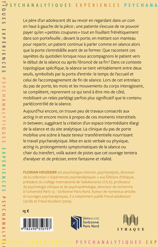 Essai de technique psychanalytique (cadre et contre-transfert). Cet ouvrage porte sur l’espace intermédiaire entre le début ou la fin de la séance en cabinet libéral et l’accompagnement du patient jusqu’à la porte : ce moment si singulier où la séance n’a pas encore débuté ou est censée s’achever ; comme on se rendort à la suite d’un réveil, comme on continue parfois son rêve entrecoupé d’un réveil, bien des patients continuent, parfois à leur insu, à parler, mettant conjointement en jeu leur corps et ses mouvements associés.