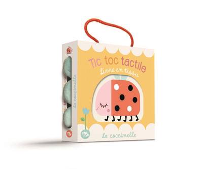 Un livre en tissu coloré en forme de coccinelle pour favoriser l'éveil sensoriel des tout-petits avec une page bruissante, différents tissus, de la broderie, des rubans et un anneau de dentition en forme d'étoile.