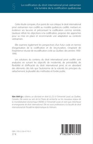 Cette étude compare, d'un point de vue critique, le droit international privé vietnamien non codifié au modèle québécois codifié, mettant en évidence ses lacunes et préconisant la codification comme remède. L'auteure réfute les objections à la codification, propose des approches pour sa mise en place et recommande une adaptation au contexte vietnamien. Elle examine également les perspectives d'un futur code en termes d'organisation de la codification et de structuration, s'inspirant de l'expérience réussie de recodification civile au Québec des années 1950- 1990. Les solutions du contenu du droit international privé codifié sont analysées en suivant les objectifs de modernité, de prévisibilité, de flexibilité et d'efficacité du droit international privé, et en abordant des éléments clés tels que l'autonomie de la volonté, les principes du rattachement, la pluralité des méthodes et l'ordre public.