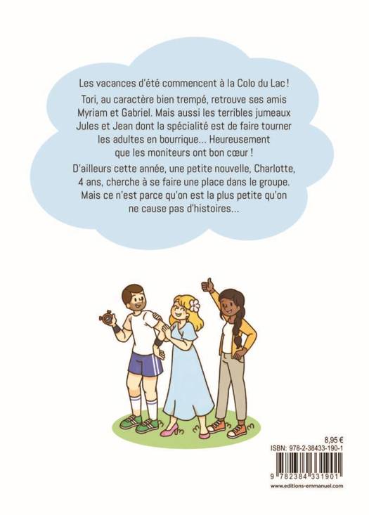 Les vacances d’été commencent à la Colo du Lac ! Tori, au caractère bien trempé, retrouve ses amis Myriam et Gabriel. Mais aussi les terribles jumeaux Jules et Jean dont la spécialité est de faire tourner les adultes en bourrique… Heureusement que les moniteurs ont bon coeur ! D’ailleurs cette année, une petite nouvelle, Charlotte, 4 ans, cherche à se faire une place dans le groupe. Mais ce n’est parce qu’on est la plus petite qu’on ne cause pas d’histoires…