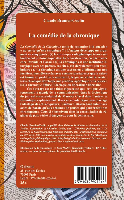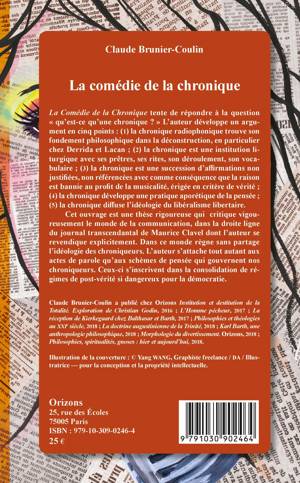 La Comédie de la Chronique tente de répondre à la question « qu'est-ce qu'une chronique ? » L'auteur développe un argument en cinq points : la chronique radiophonique trouve son fondement philosophique dans la déconstruction ; la chronique est une institution liturgique avec ses prêtres, ses rites, son déroulement, son vocabulaire ; la chronique est une succession d'affirmations non justifiées ? la raison est bannie au profit de la musicalité, érigée en critère de vérité ; la chronique développe une pratique aporétique de la pensée ; la chronique diffuse l'idéologie du libéralisme libertaire. Cet ouvrage est une thèse rigoureuse qui critique le monde de la communication, dans la droite ligne de Maurice Clavel dont l'auteur se revendique. Dans ce monde règne sans partage l'idéologie des chroniqueurs. L'auteur s'attache aux actes de parole, aux schèmes de pensée qui gouvernent nos chroniqueurs. Ceux-ci s'inscrivent dans la consolidation de régimes de post-vérité si dangereux pour la démocratie.