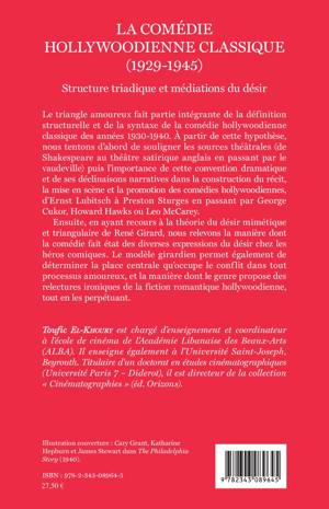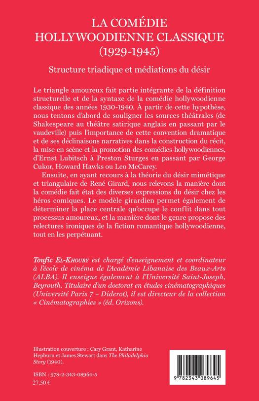 Le triangle amoureux fait partie intégrante de la définition structurelle et de la syntaxe de la comédie hollywoodienne classique des années 1930-1940. A partir de cette hypothèse, sont abordées les sources théâtrales puis l'importance de cette convention dramatique et de ses déclinaisons narratives dans la construction du récit, la mise en scène et la promotion des comédies hollywoodiennes, d'Ernst Lubitsch à Preston Sturges en passant par George Cukor, Howard Hawks ou Leo McCarey. La théorie du désir mimétique de René Girard éclaire aussi la fiction romantique hollywoodienne.