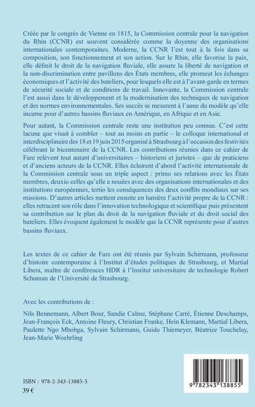 Doyenne des organisations internationales contemporaines, la Commission centrale pour la navigation du Rhin (CCNR), créée en 1815, favorise la paix, définit le droit de navigation, assure la non-discrimination entre pavillons, promeut les échanges économiques et protège l'activité des bateliers. Elle devient un modèle à suivre pour d'autres bassins fluviaux en Amérique, en Afrique et en Asie. Ce colloque vise à la faire connaître.