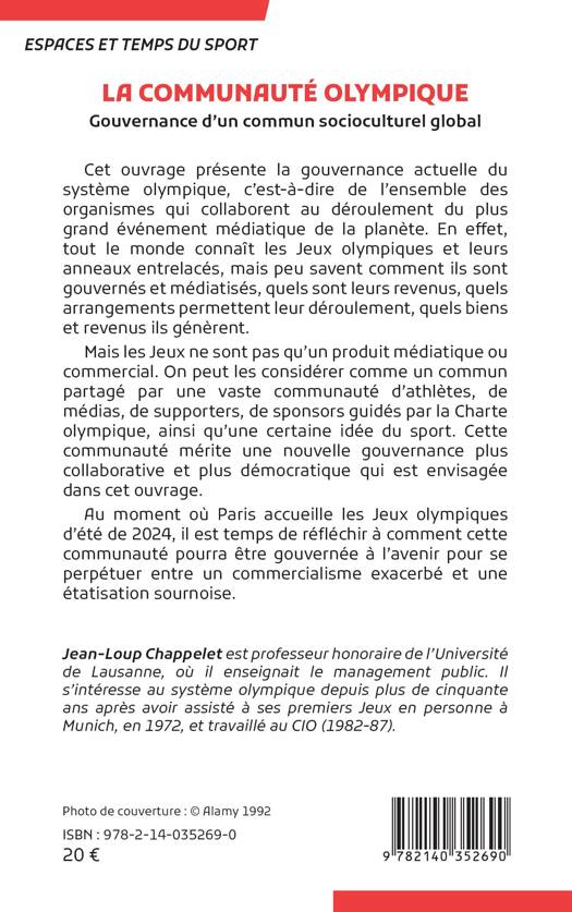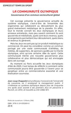 Cet ouvrage présente la gouvernance actuelle du système olympique, c'est-à-dire de l'ensemble des organismes qui collaborent au déroulement du plus grand événement médiatique de la planète. En effet, tout le monde connaît les Jeux olympiques et leurs anneaux entrelacés, mais peu savent comment ils sont gouvernés et médiatisés, quels sont leurs revenus, quels arrangements permettent leur déroulement, quels biens et revenus ils génèrent. Mais les Jeux ne sont pas qu'un produit médiatique ou commercial. On peut les considérer comme un commun partagé par une vaste communauté d'athlètes, de médias, de supporters, de sponsors guidés par la Charte olympique, ainsi qu'une certaine idée du sport. Cette communauté mérite une nouvelle gouvernance plus collaborative et plus démocratique qui est envisagée dans cet ouvrage. Au moment où Paris accueille les Jeux olympiques d'été de 2024, il est temps de réfléchir à comment cette communauté pourra être gouvernée à l'avenir pour se perpétuer entre un commercialisme exacerbé et une étatisation sournoise.
