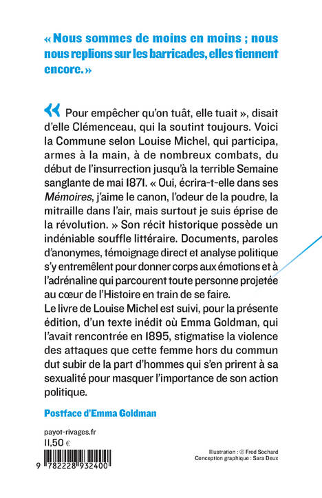 "Pour empêcher qu'on tuât, elle tuait", disait d'elle Clémenceau, qui la soutint toujours. Voici la Commune selon Louise Michel, qui participa, armes à la main, à de nombreux combats, du début de l'insurrection jusqu'à la terrible Semaine sanglante de mai 1871. "Oui, écrira-t-elle dans ses Mémoires, j'aime le canon, l'odeur de la poudre, la mitraille dans l'air, mais surtout je suis éprise de la révolution." Son récit historique possède un indéniable souffle littéraire. Documents, paroles d'anonymes, témoignage direct et analyse politique s'y entremêlent pour donner corps aux émotions et à l'adrénaline qui parcourent toute personne projetée au coeur de l'Histoire en train de se faire. Le livre de Louise Michel est suivi, pour la présente édition, d'un texte inédit où Emma Goldman, qui l'avait rencontrée en 1895, stigmatise la violence des attaques que cette femme hors du commun dut subir de la part d'hommes qui s'en prirent à sa sexualité pour masquer l'importance de son action politique.