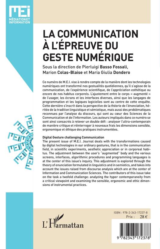 Ce numéro de M.E.I vise à rendre compte de la manière dont les technologies numériques ont transformé nos gestualités quotidiennes. Cette enquête s’inscrit dans la perspective de la théorie de l’énonciation, mais aussi des problématiques reconnues par l’analyse du discours, qui sont au cœur des Sciences de la Communication et de l’Information. Les auteurs impliqués dans ce numéro se sont ainsi consacrés à relever un double défi : analyser l’ultra-contemporain de manière critique et réinterroger à nouveau frais les dimensions sensible, ergonomique et éthique des pratiques instrumentées.