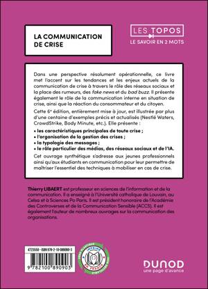 Écrit par un spécialiste du sujet, complet et illustré par plus d’une centaine d’exemples, ce livre présente : • les caractéristiques principales de toute crise ; • la gestion des crises ; • la typologie des messages ; • la place des médias, des réseaux sociaux et de l'IA.